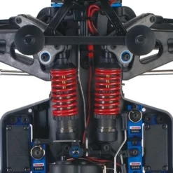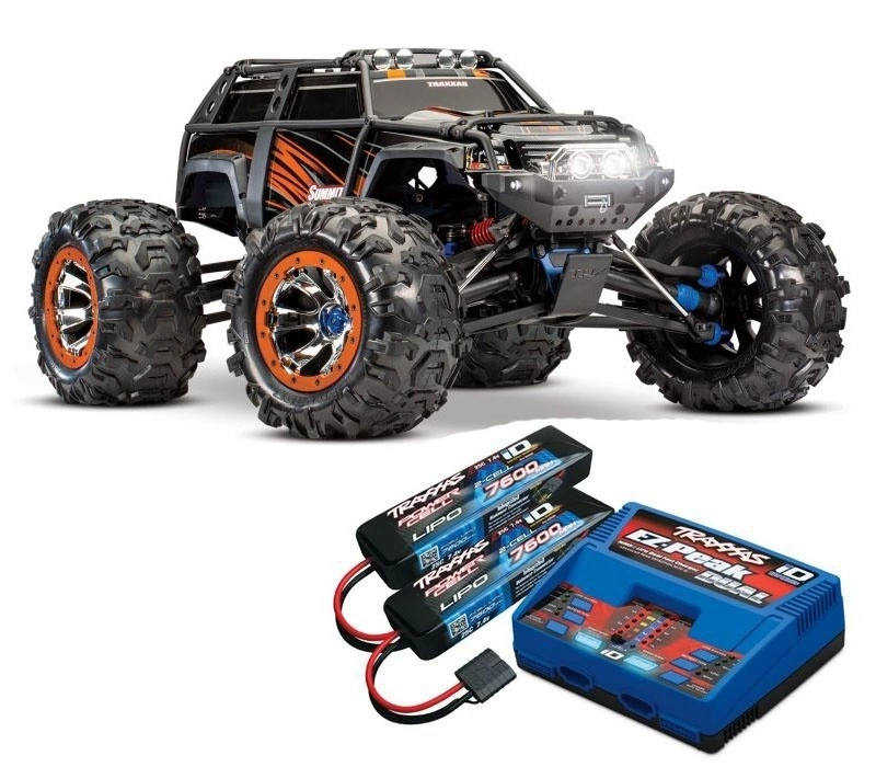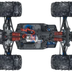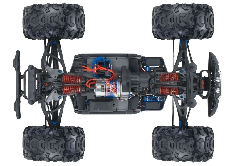 Die Entwicklung beim Monstertruck geht weiter und findet derzeit mit dem ersten über Fernsteuerung schaltbaren Sperrdifferential im Summit von TRAXXAS seinen neuen Höhepunkt. Das vordere und das hintere Differential können einzeln oder zusammen vom Sender aus gesperrt bzw. geöffnet werden. Damit bietet der Summit den vollen Spaß auf dem Racetrack und auch daneben, wo Hindernisse im Weg liegen, die von herkömmlichen Trucks nicht bezwungen werden können. Einfach vom Sender aus auf den extrem kurz (70:1) untersetzten Gang schalten, Differentiale sperren und schon klettert der Summit über Steine, Äste, wühlt sich durch losen Grund und erklimmt Steigungen, die für herkömmliche Trucks aus Aus bedeuten würden. Durch das vom E-REVO bekannte Chassis-Konzept mit superlangen Federwegen und die riesigen neuen Canyon AT-Reifen ergibt sich eine Bodenfreiheit die andere Fahrzeuge dieser Größe nicht bieten können. Damit und der kurzen Untersetzung und den Differentialsperren lassen sich praktisch alle Hindernisse überwinden. Zurück auf dem Track Diffs und Getriebe umschalten und Gummi geben, Spaß pur!