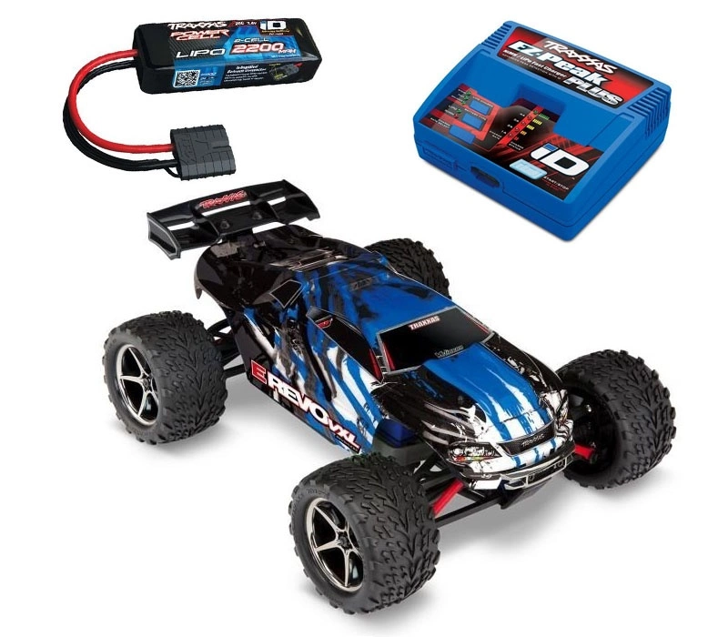 1/16 E-Revo VXL BlauX mit NiMh Akku, 12V Ladegerät und zusätzlich oroginal Traxxas 2S LiPo Akku und EZ-Peak Plus Ladegerät