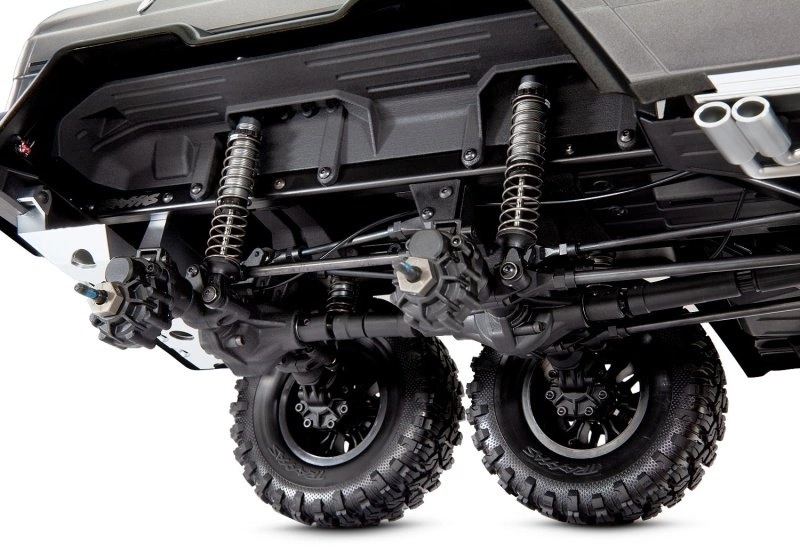 Traxxas erzielt mit drei sendergesteuerten Sperrdifferentialen einen weiteren RC-Sieg. Lassen Sie die Differentiale freigeschaltet, um den engen Wenderadius des TRX-6 auch bei 6-Rad-Antrieb und langem Radstand zu nutzen. Das vordere Differential sperren oder beide Hinterachsen gleichzeitig sperren, um eine extreme Traktion mit Allradantrieb zu erzielen. Mit Schläuchen versehene Mikrokabel steuern die Differenzialwirkung für das Erscheinungsbild des Scale-Erlebnisses.